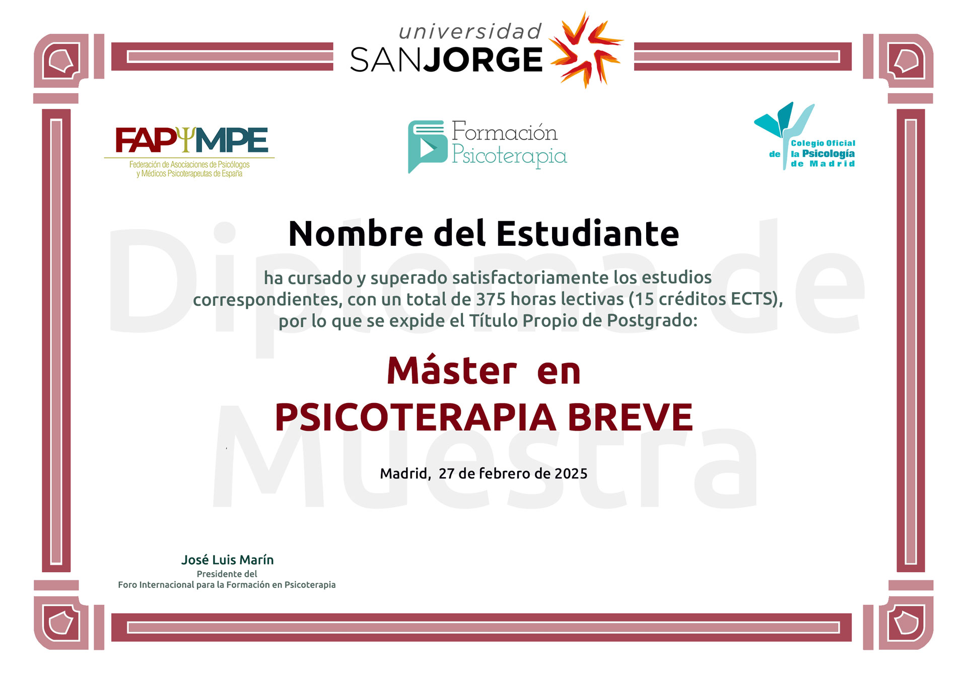 Diploma de Máster en Psicoterapia Breve, acreditado por: